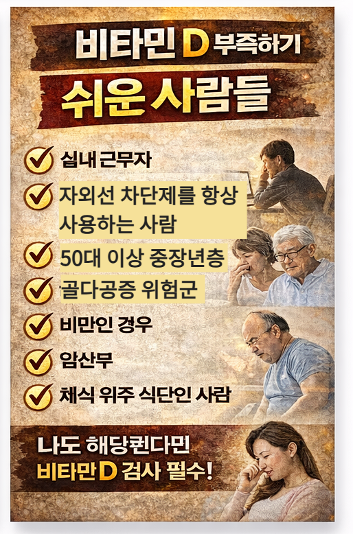 비타민 D가 부족하기 쉬운 사람들은 실내 근무를 하는 직장인, 자외선 차단제를 항상 사용하는 사람, 50대 이상 중장년층은 대표적인 위험군입니다. 나이가 들수록 피부의 합성 능력이 감소하기 때문입니다. 또한 비만인 경우에는 비타민 D가 지방 조직에 저장되면서 혈중 농도가 낮게 나타날 수 있습니다. 임산부나 채식 위주의 식단을 유지하는 사람 역시 부족 위험이 높습니다.