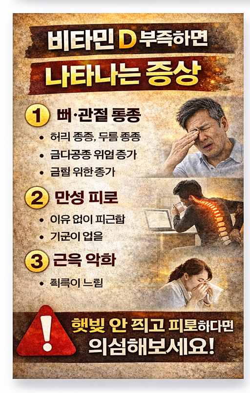 적절한 햇빛 노출과 균형 잡힌 식사, 필요하다면 전문가 상담을 통한 보충제 선택까지, 작은 관리가 뼈 건강과 면역력, 그리고 전반적인 활력을 지키는 데 중요한 역할을 합니다. 몸이 보내는 신호를 무시하지 않는 것이 건강 관리의 첫걸음입니다.