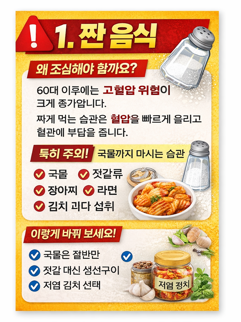 젊을 때는 괜찮았던 음식이 60대 이후에는 혈관, 심장, 췌장에 부담을 줄 수 있습니다. 특히 고혈압, 당뇨병, 고지혈증은 60대 이후 가장 흔한 만성질환입니다.