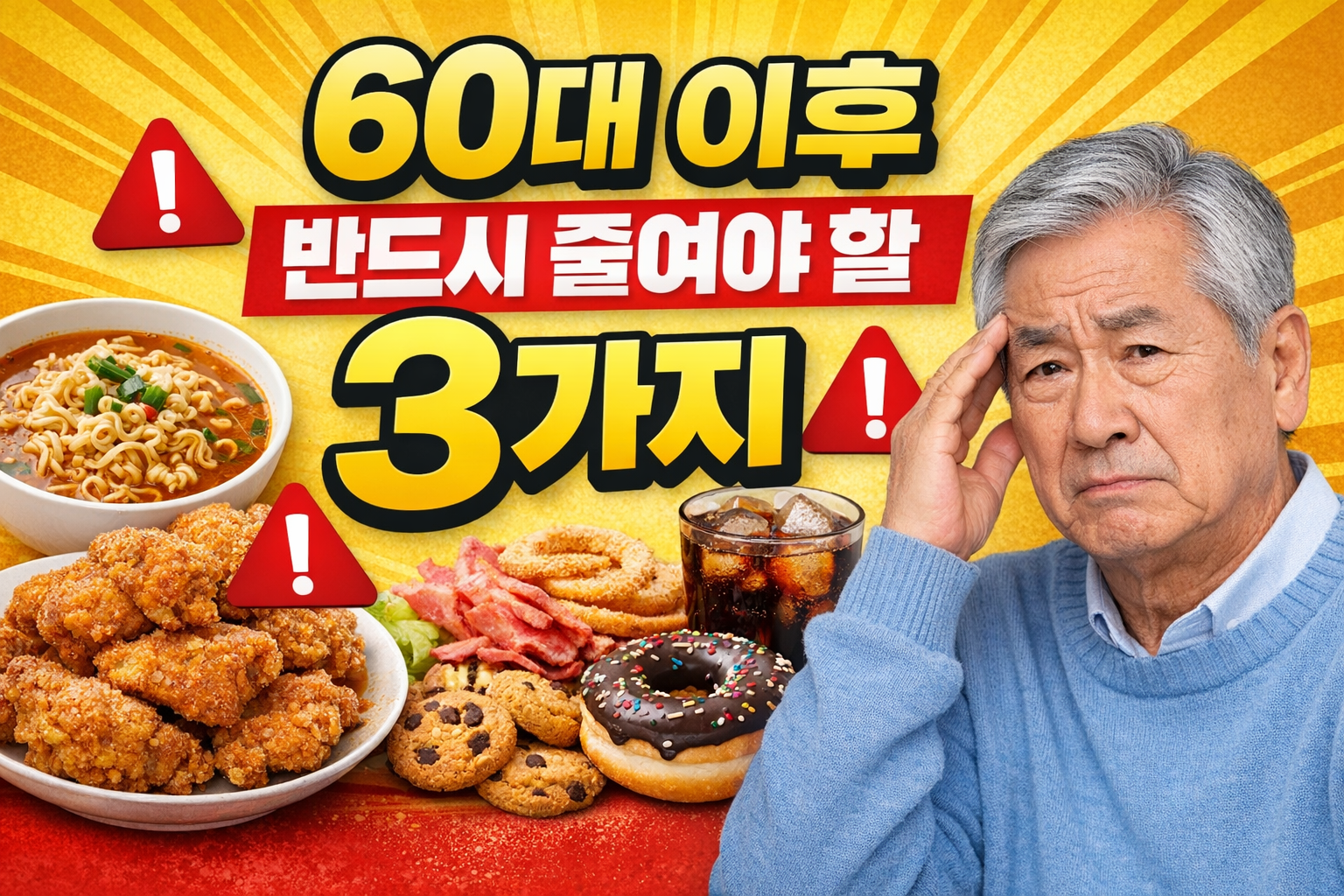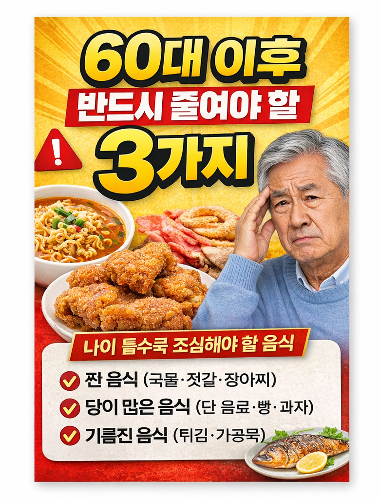 오늘은 60대 건강관리를 위해 반드시 줄여야 할 음식 3가지를 정리해드립니다.